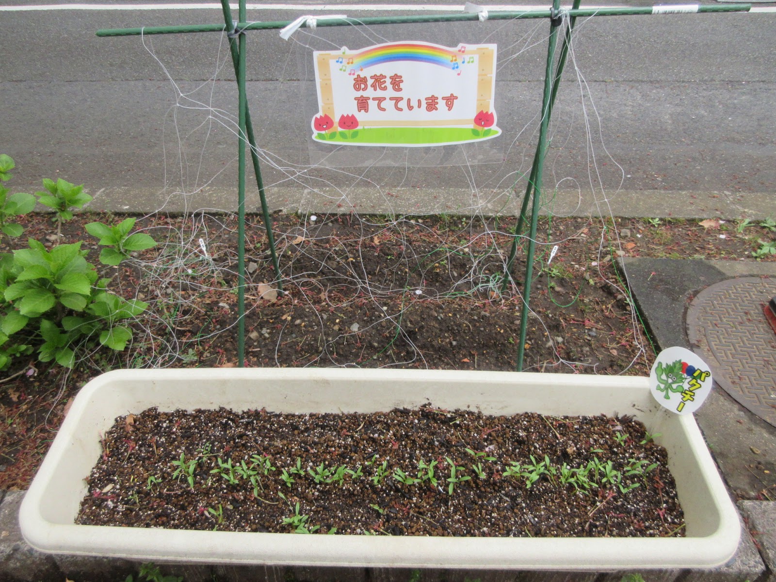 会社の近隣の花壇とプランターに、パクチーと朝顔、向日葵、百日草を植えました。