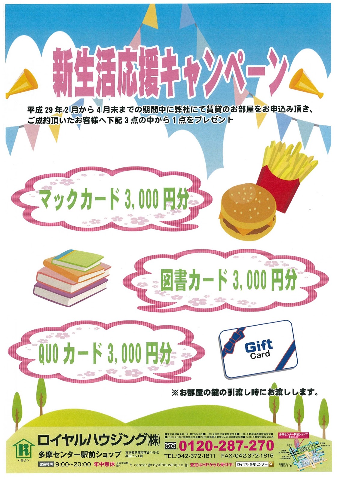 話は変わりますが3月31日まで賃貸新生活応援キャンペーンを実施しております。成約になったら選べる商品券¥3,000分をプレゼントしています♪ご来店お待ちしております。 -
